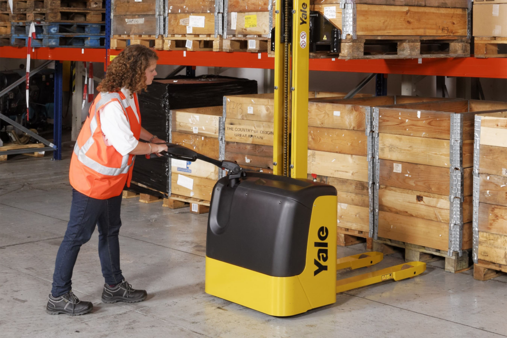 - Apiladores tipo walkie: ideales para pasillos angostos, carga de hasta 2 toneladas, altura de elevación de 3 a 5 metros. Perfectos para tiendas de autoservicio, centros de distribución medianos y cámaras frigoríficas.