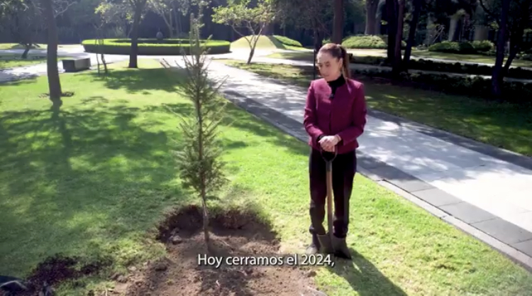 En redes sociales, con pala en mano, la mandataria mexicana dio a conocer su mensaje de Año Nuevo al mismo tiempo en que plantaba un árbol en Palacio Nacional.