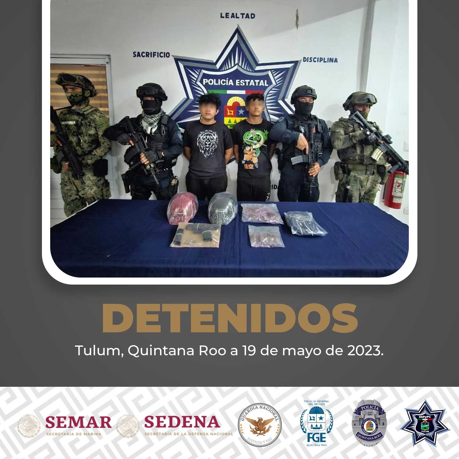 En un operativo coordinado por la Policía Municipal, Policía Estatal, Semar y Fiscalía General del Estado, los presuntos delincuentes se identificaron como Kebi N., de 19 años, y Jorge N., de 22 años, originarios de Chiapas y Tabasco, respectivamente.