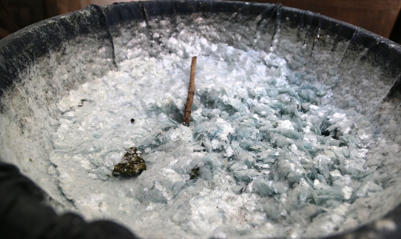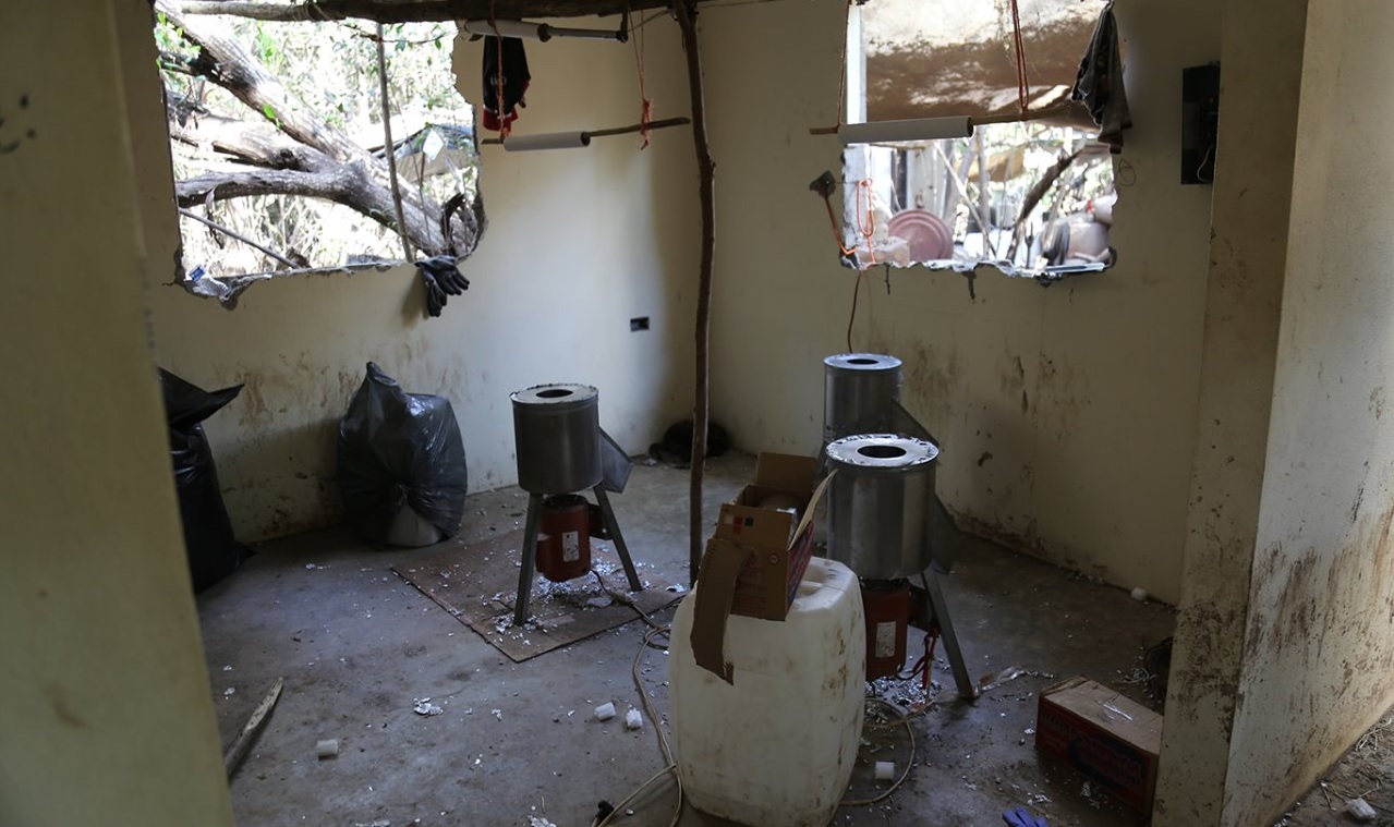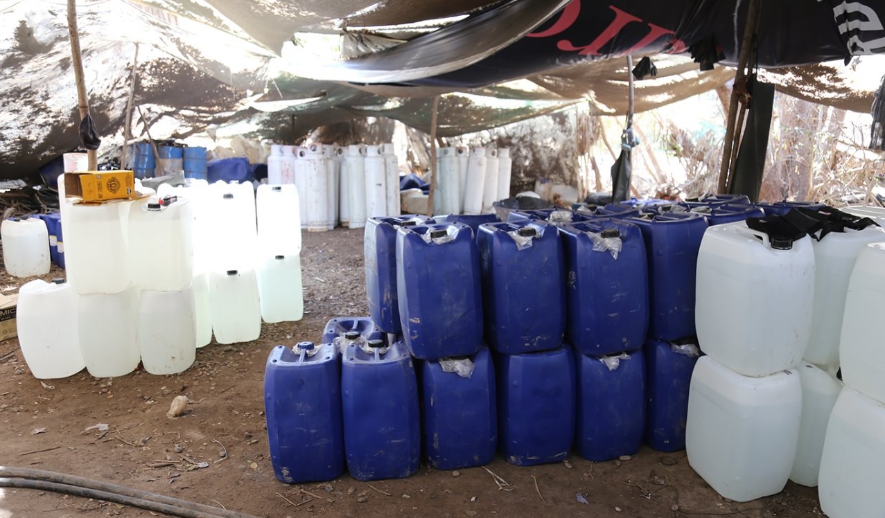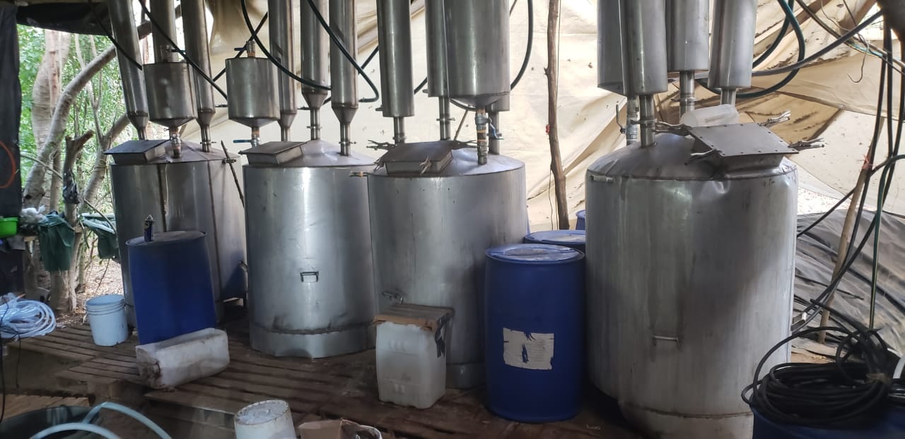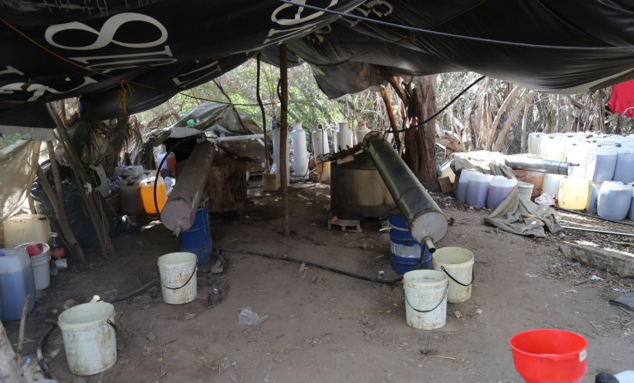 100 bidones de 50 litros de diversos líquidos, 70 tambos metálicos de 50 litros cada uno, 58 tanques de gas, 50 costales con una sustancia granulada de color blanco, 18 costales con sosa cáustica, 18 ventiladores, 14 tinas de plástico, 10 ollas, siete casas de campaña, cuatro reactores, cinco refrigeradores y una lavadora. Posteriormente encontramos 100 bidones nuevos para recopilar líquidos, y dos tinacos con capacidad de 5 mil litros enterrados, además de un sistema de refrigeración.