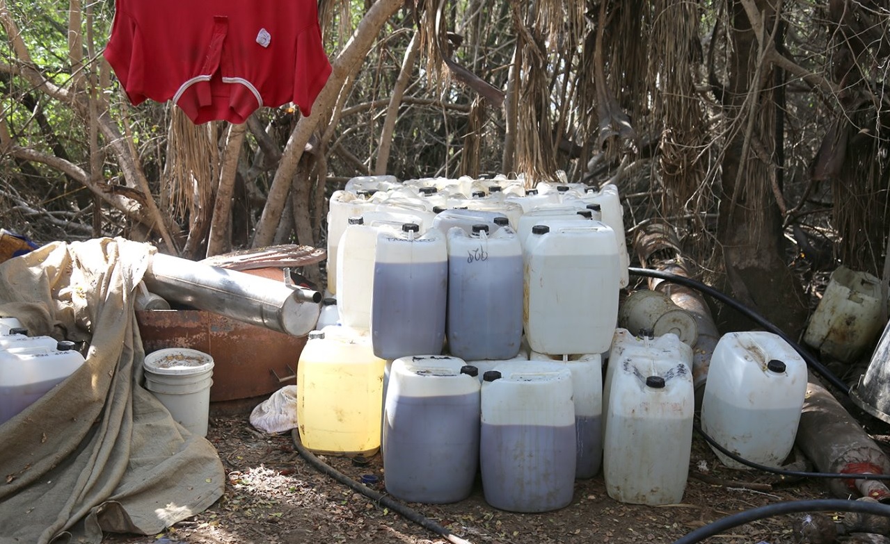 Alternativo.mx / Policías estatales (PEP) realizaban trabajos de seguridad, cuando detectaron entre la maleza, en una zona rural, un laboratorio clandestino en el margen del río San Lorenzo, al suroeste de la sindicatura de Eldorado, perteneciente a Culiacán en Sinaloa.