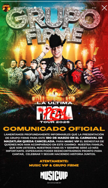 “Lamentamos profundamente informarles que la presentación de Grupo Firme en el Carnaval de Mazatlán queda cancelada.”