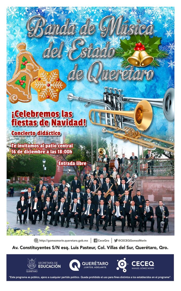 El 16 de diciembre a las 17:00 horas, se tendrá el show musical “Sonriendo a la Navidad” con Semillita y Melodía; posteriormente a las 18:00 horas, dará comienzo el concierto didáctico navideño con la Banda del Estado de Querétaro en coordinación con la Secretaría de Cultura (SECULT). Ambos eventos en el patio central.