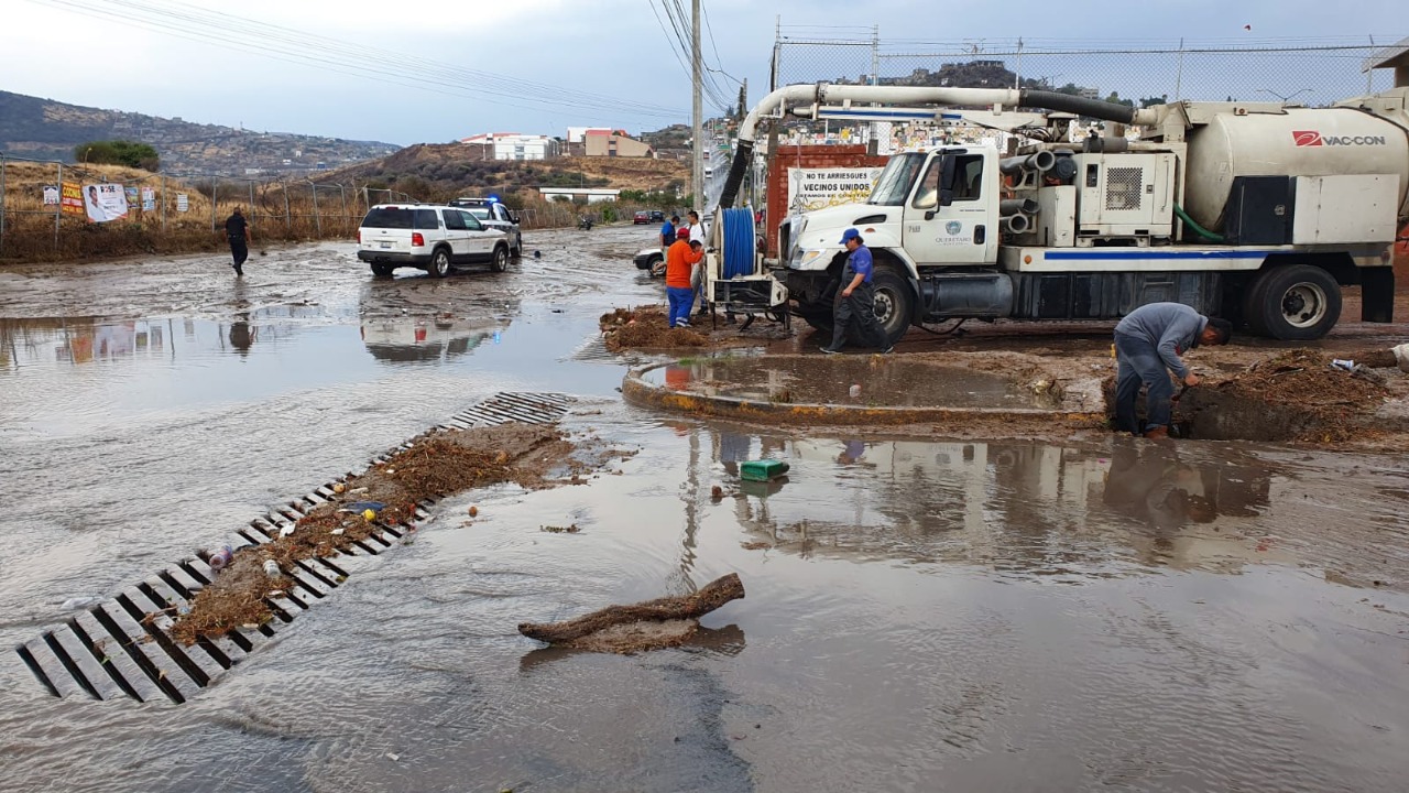 Personal de Protección Civil, Servicios Públicos, Guardia Municipal, Obras Públicas y de las Delegaciones de Santa Rosa Jáuregui y Epigmenio González, se desplegó esta tarde para atender las afectaciones generadas por las lluvias en la zona norte de la ciudad.