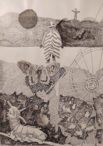 En su trazo firme y el puntillismo cuando se requiere, de l autor utiliza el delicado contraste entre las líneas del boceto e imágenes más bien oscuras.