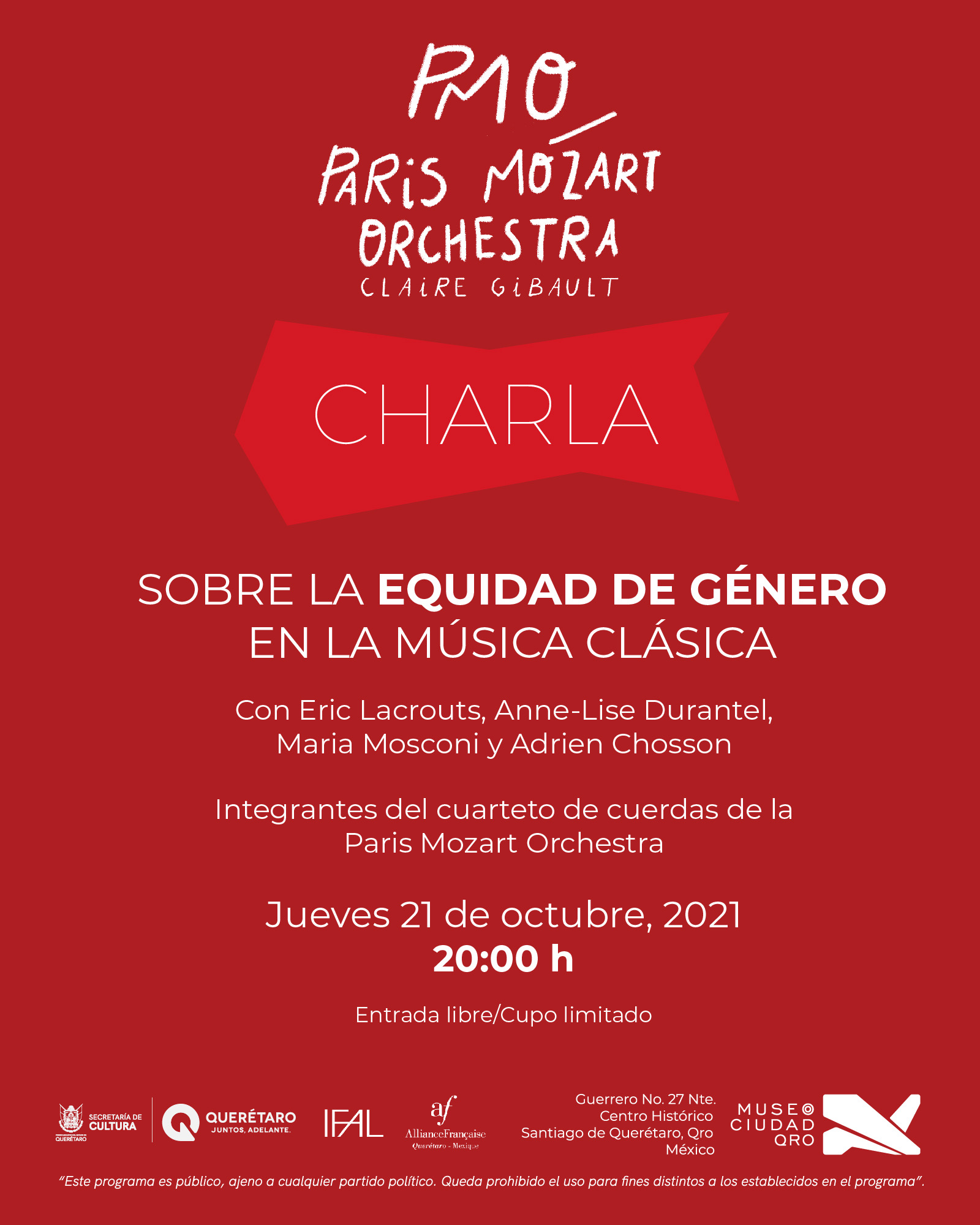 Como parte de su visita a la capital del estado, la ´Paris Mozart Orchestra’ brindará una charla sobre equidad de género en la música, la cual se llevará a cabo el viernes 22 de octubre a las 20:00 horas en el Museo de la Ciudad, cuya entrada será libre, respetando el 75 por ciento de aforo.