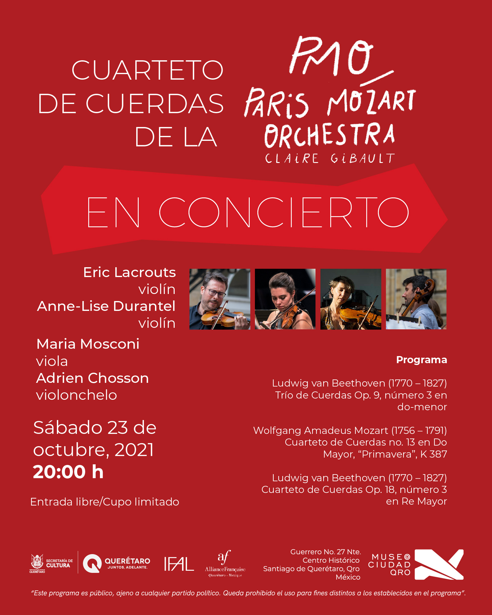 Esta es la primera vez que la ‘Paris Mozart Orchestra’ se presenta en Querétaro, en donde gracias al apoyo de la Secretaría de Cultura y de la Embajada de Francia en México, la entrada será gratuita con un cupo limitado a 100 personas, esto en cumplimiento de las medidas sanitarias vigentes.
