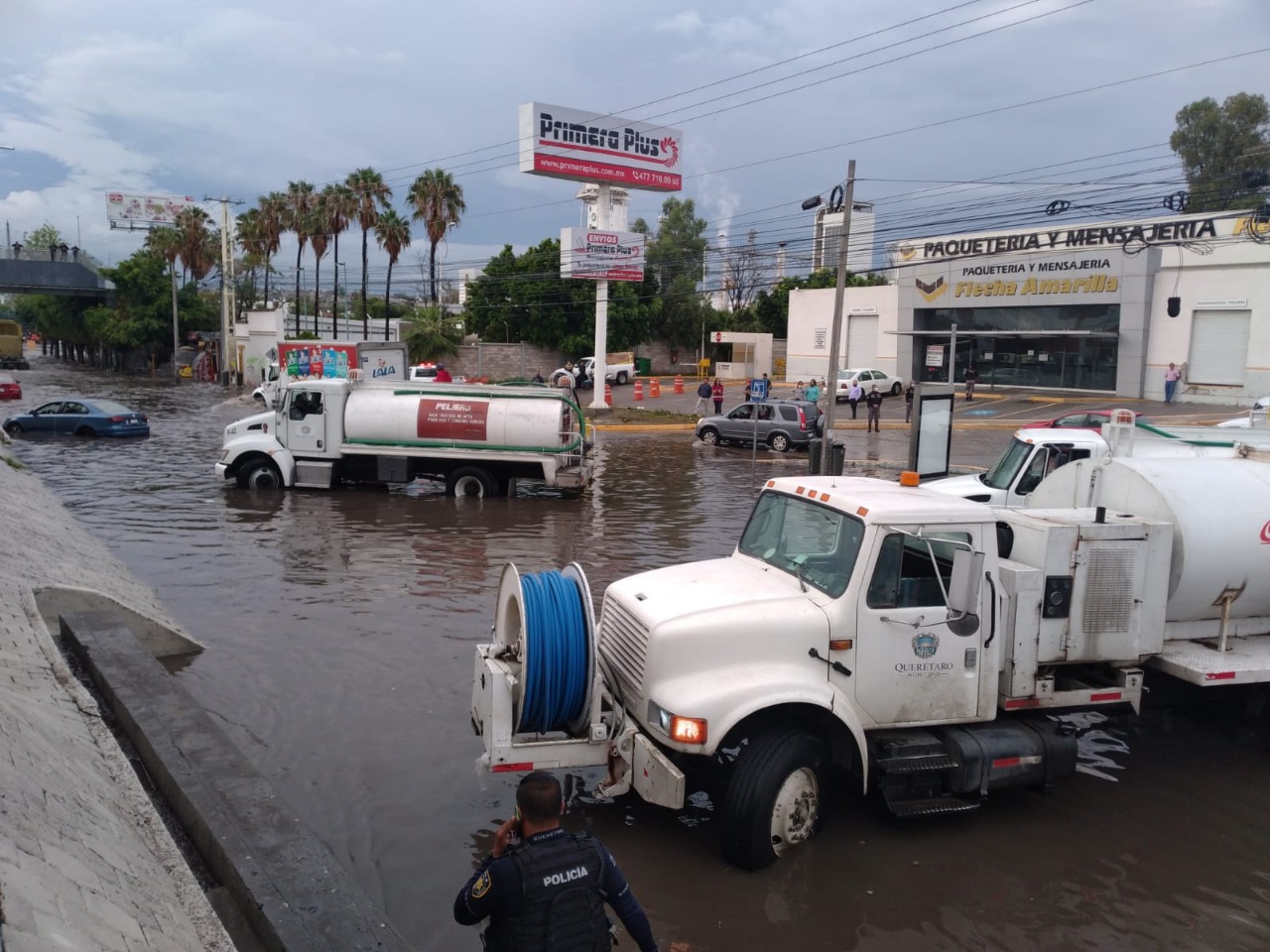 Personal de la Secretaría de Movilidad, en coordinación con la autoridad de Seguridad Pública, realizó el cierre parcial de algunas incorporaciones y desincorporaciones de la Avenida 5 de febrero, a la altura de avenida Universidad, así como del puente de Carrillo, con la finalidad de facilitar el trabajo del personal de la Secretaría de Servicios Públicos Municipales para desalojar el agua que se acumuló en la parte inferior del puente.