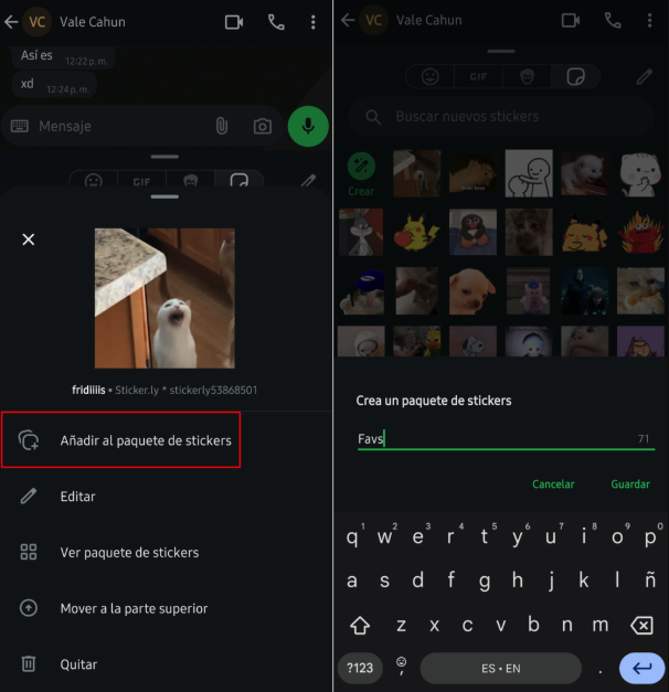 5. El nuevo paquete aparecerá en la sección de stickers, justo antes de los que vienen por defecto en la app.